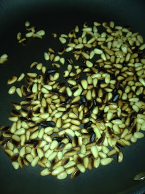 -Toast the pine nuts in a pan over medium-low heat until they are just lightly browned and fragrant (approx. 2-3 minutes).