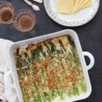 • Assemble the gratin. Place the asparagus in a medium baking dish (I like a 9” x 11” or9” x 13”) in an even layer. Pour the cream mixture on top of the asparagus and toss to evenly distribute. Sprinkle the asparagus with the remaining ½ cup Austrian Mountain cheese and the garlicky breadcrumbs.