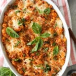 This pasta is both mind-blowing and life-changing, and I truly feel like it has the potential to develop Dude Diet cult status alongside the Cheeseburger Quinoa Bake and Buffalo Fingies. Loaded with a lean ground chicken meat sauce, and topped with melt-y fresh mozzarella, Parmesan, and crispy, crunchy Panko breadcrumbs, this baby has all the comforting, drool-worthy chicken Parm flavors you love, just in a slightly healthier form. HALLELUJAH.
