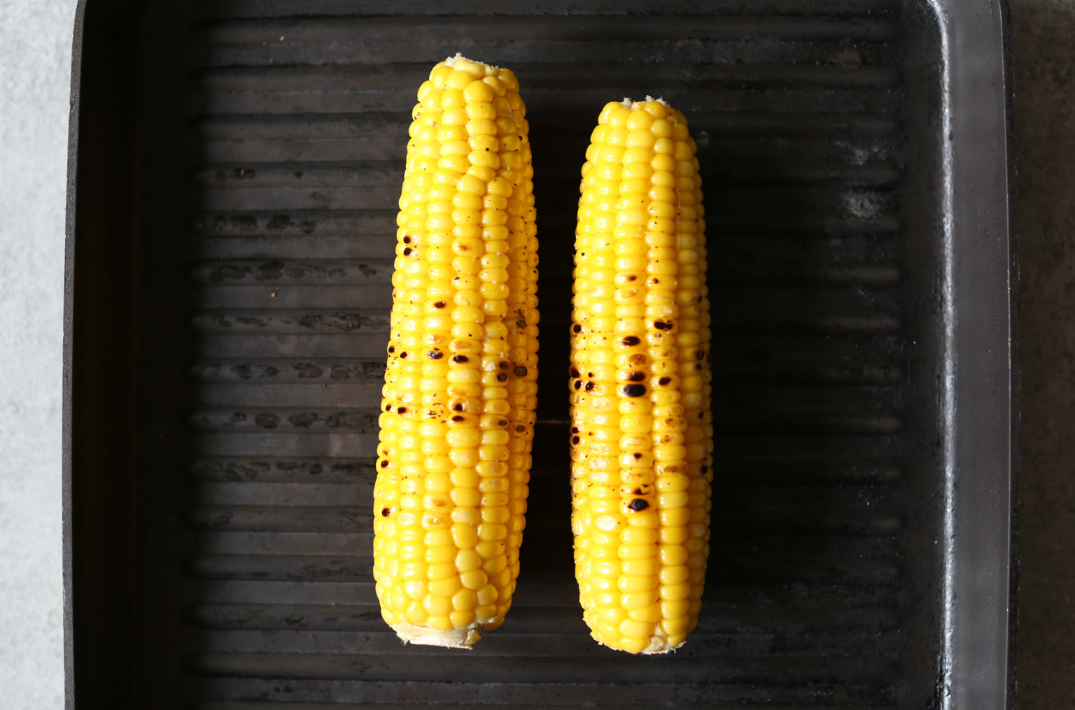 -Lightly brush the corn all over with olive oil and season with a little bit of salt. Place the ears of corn directly on the hot grill. Cook for 10-12 minutes, rotating the corn every 2-3 minutes, until the kernels deepen in color and are lightly charred in spots. Let cool slightly, then use a sharp knife to slice the kernels from each cob. Set aside.