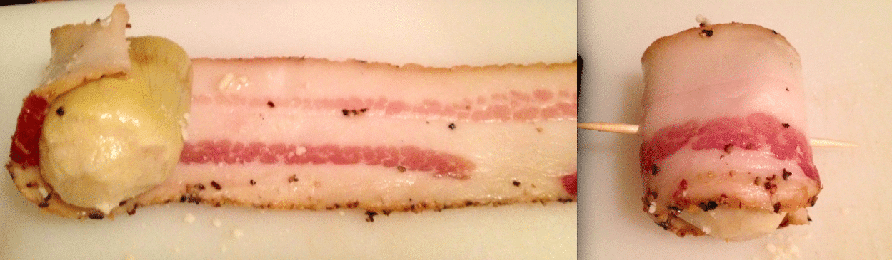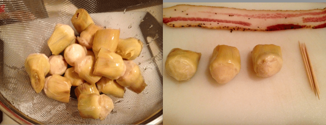 • 2 jars cooked baby artichokes approx. 24 pieces. Any type will do. They are often jarred in some sort of marinade…so feel free to pick your poison. These can be found in most markets and Italian specialty stores.1 packet (12 pieces) of bacon. Peppered bacon is always a good choice…