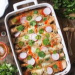 • Garnish enchiladas with extra cilantro, radishes, and hot sauce (or toppings of your choice) and serve warm.
