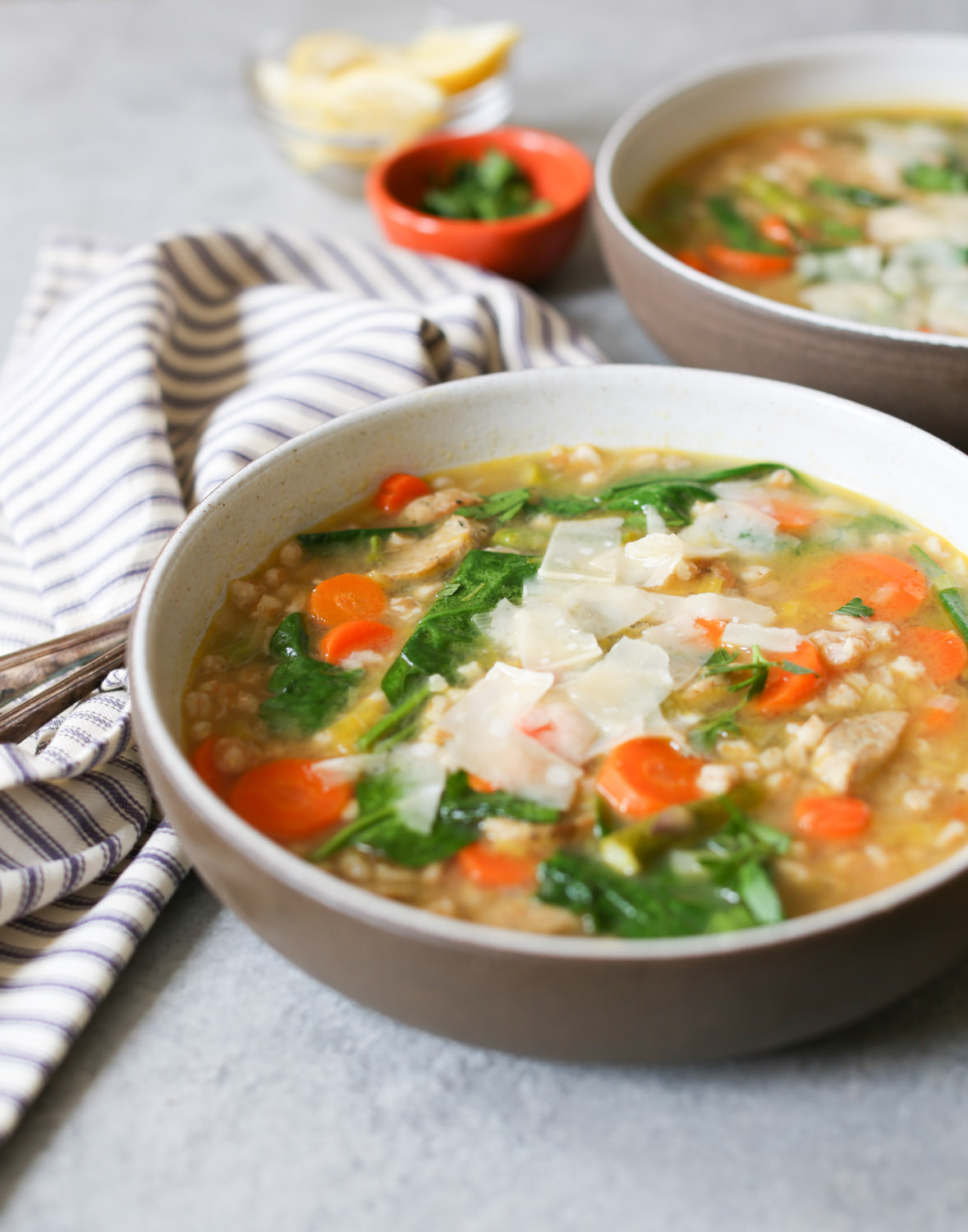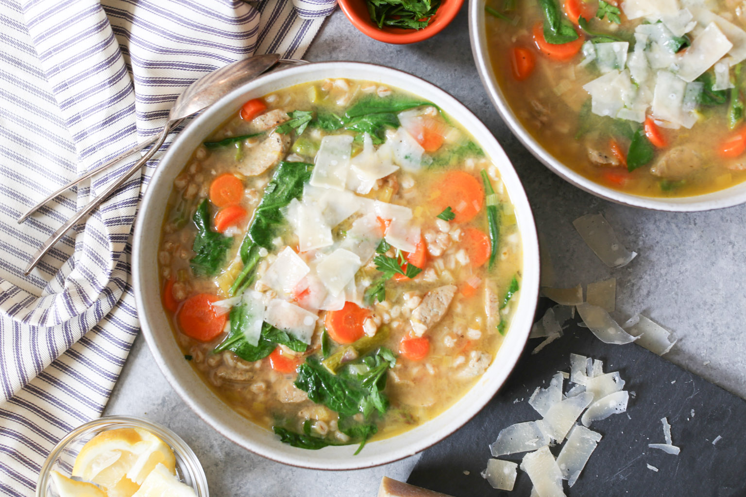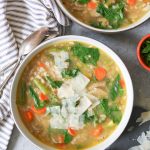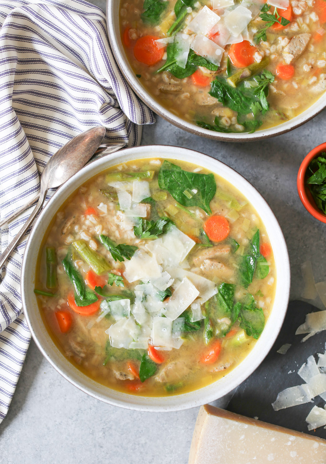 A couple quick recipe notes and you do you options. First, this soup freezes fabulously, so I highly recommend making a double batch and freezing half for future busy/lazy days. Vegetarians should feel free to ditch the sausage and add some white beans or chickpeas for protein, and gluten-free folks, you can sub quinoa or brown rice for the farro. (If using brown rice, please cook it before adding it to the soup. Uncooked rice will absorb too much liquid, capiche?) And don’t be afraid to experiment with different greens! I love spinach, but the soup is also excellent with arugula, kale, and even dandelion greens, so throw in whatever you have on hand.