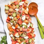 In case you’re not familiar with its wonders, panzanella is a Tuscan bread salad that’s usually made with chunks of dried bread tossed with ripe tomatoes, olive oil and vinegar. The bread gets saturated (but still retains a little crunch) with the tomato juices and dressing, and the result is a highly textured, vibrant taste treat that is so much more than the sum of its parts. This version incorporates sweet nectarines (my go-to summer stone fruit), crunchy cucumbers, fresh basil, and plenty of creamy mozzarella. It’s a fabulous light meal on its own, but it’s also the perfect side for summer picnics and barbecues, since it comes together quickly/travels extremely well. (And while it doesn’t photograph in the sexiest way, it’s actually quite the showstopper in person. Promise.)