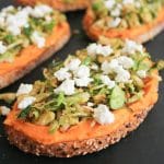 Sweet Potato Hummus Tartine with Toasted Brussels Sprouts and Goat Cheese