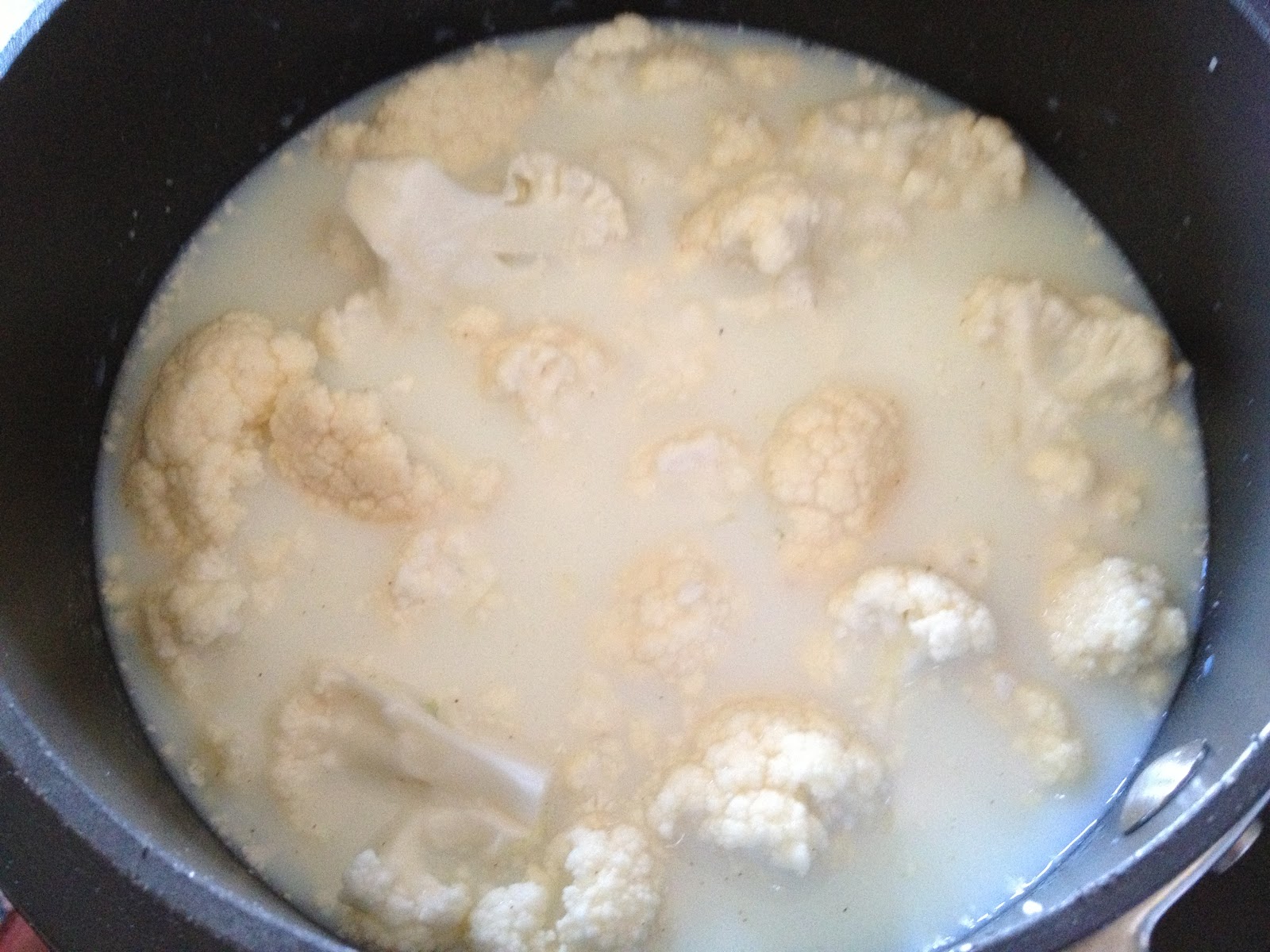 • Put the cauliflower and milk in a medium-sized pot. Bring to a simmer. Simmer covered for about 15 minutes until the cauliflower is very tender.